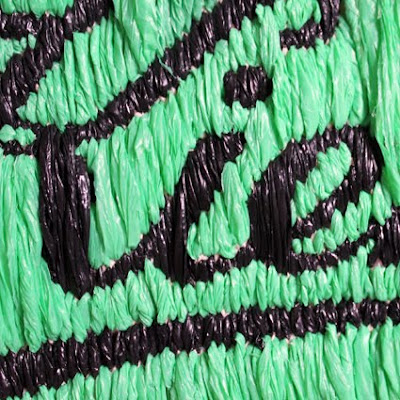 I cut the bags into very narrow strips, rolled them into thread and used it to embroider the logo in black and fill in the rest with colour.This technique was chosen to symbolize how much time and energy is consumed to process plastic that is thrown out to be buried or recycled, and at the same time, to remind people that it's up to us to use it responsibly. We can chose to treat it as garbage or we can look at it as something that's still useful, even potentially beautiful.